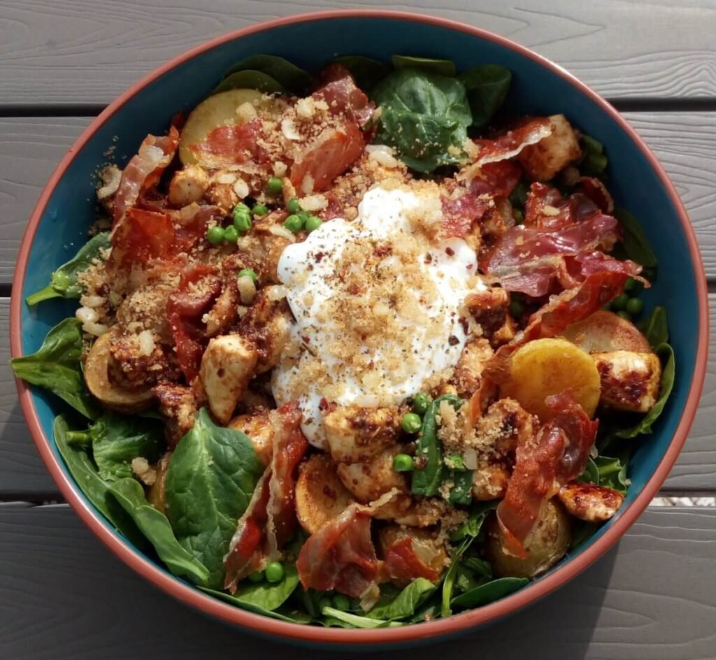 Salade van spinazie en gemarineerde kip