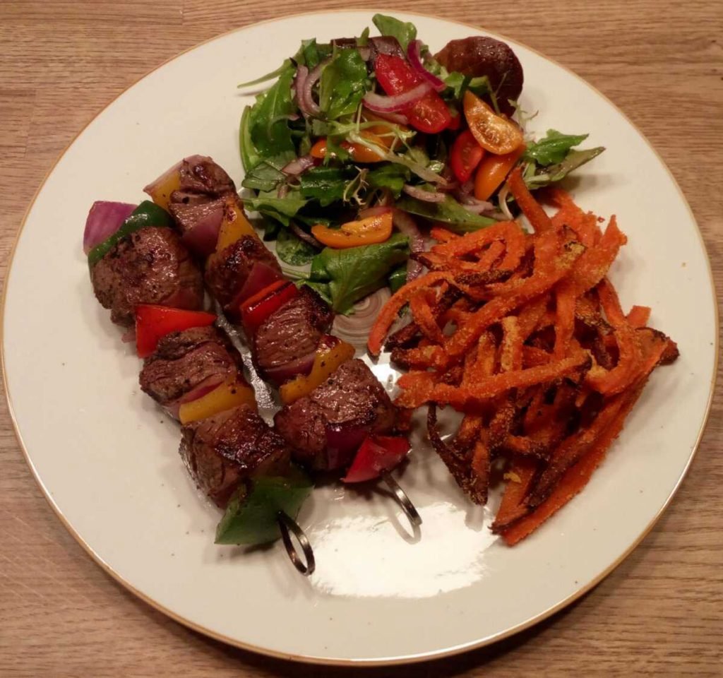 Rundsbrochette met zoete aardappelfrietjes en salade