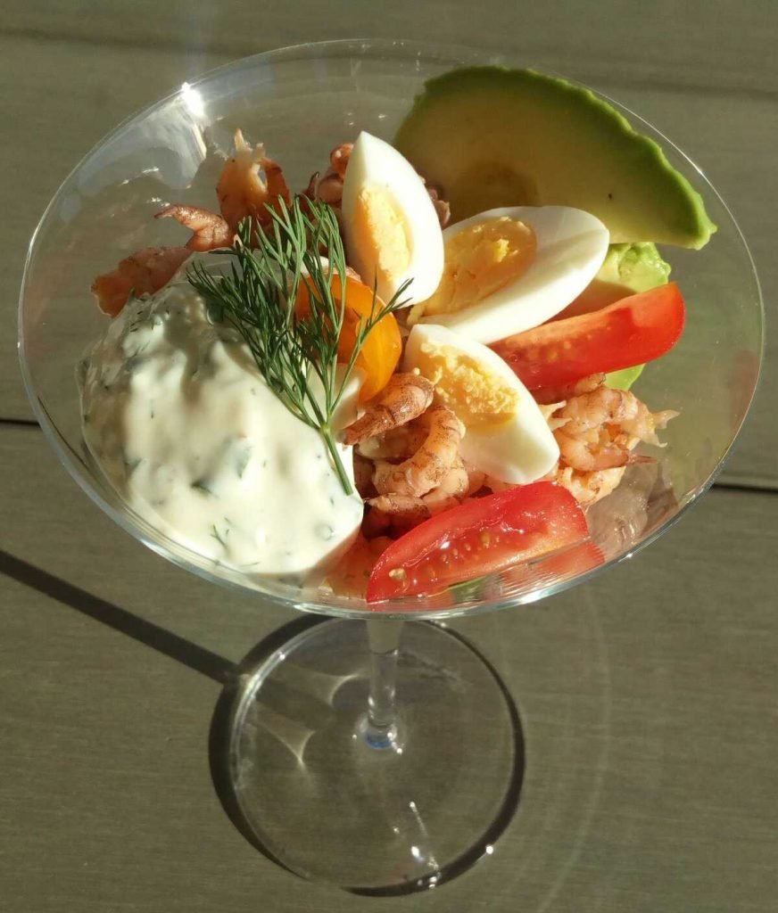 garnaalcocktail met avocado, handgepelde garnaaltjes en kwarteleitjes