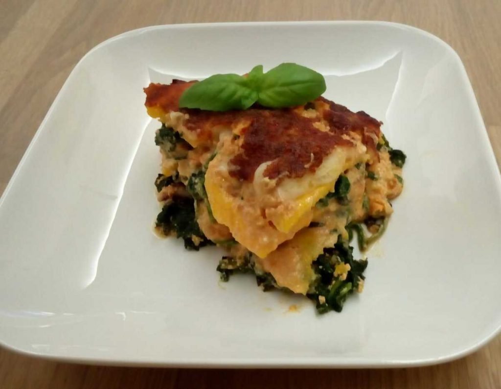 Pompoenlasagne met zeevruchten, ricotta en spinazie