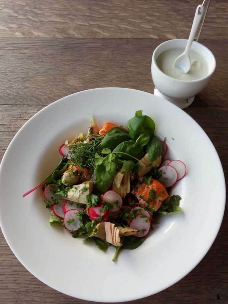 Kruidige salade met warmgerookte zalm met gorgonzoladressing
