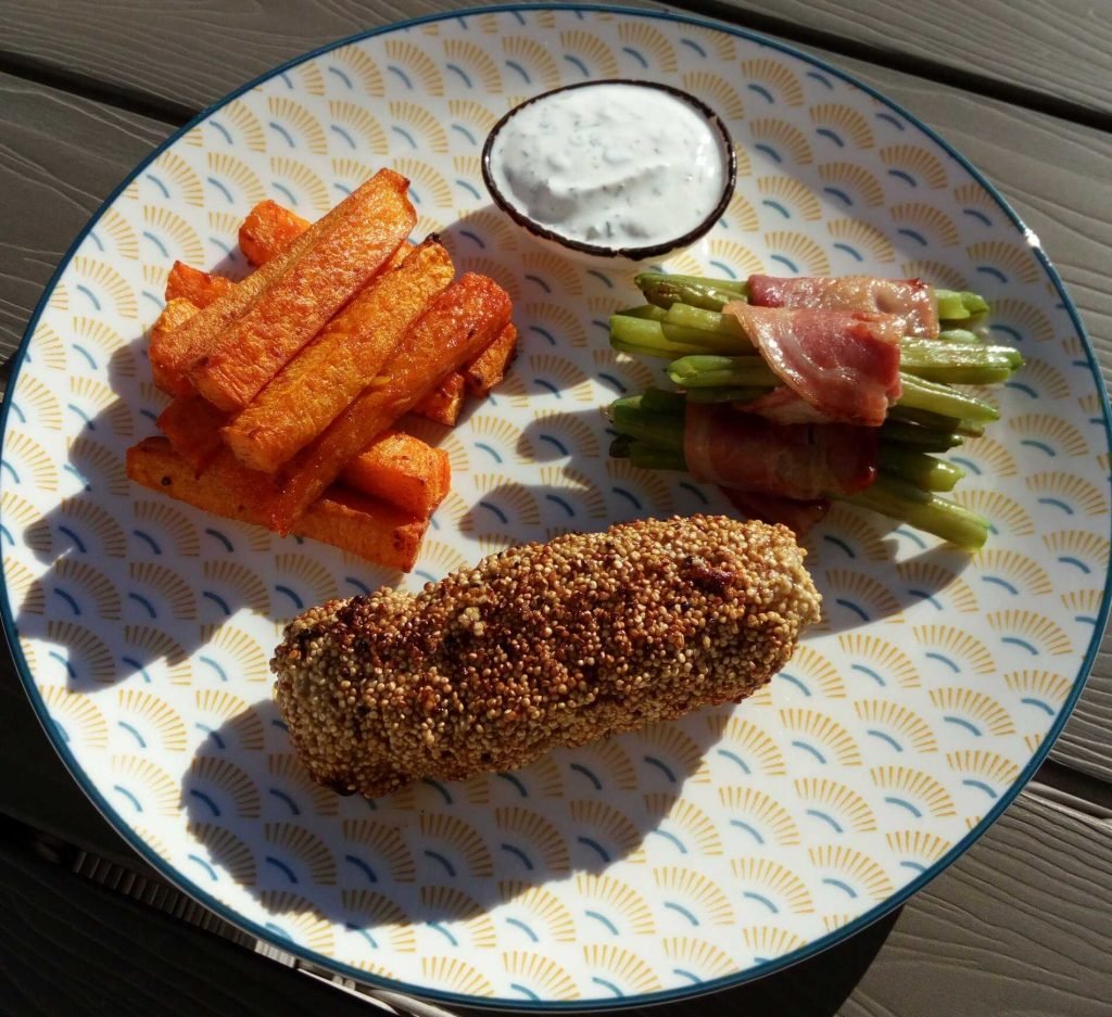 Kalkoenrolletje in een krokant jasje met pompoenfrietjes