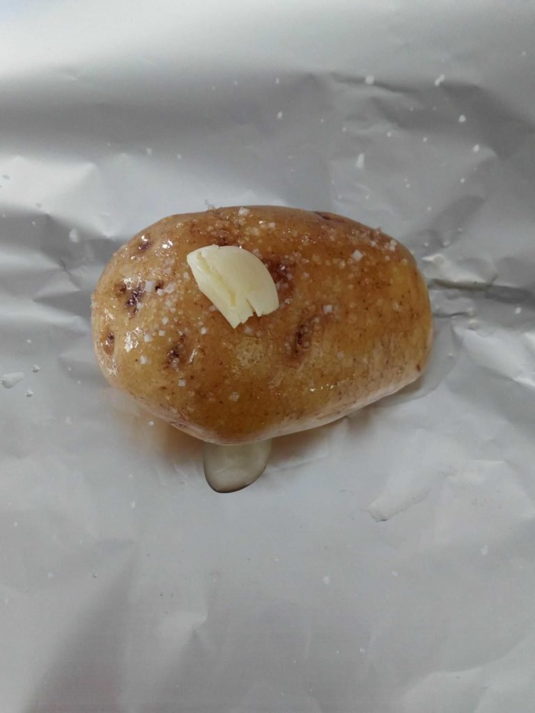 Gepofte aardappelen met pulled chicken aardappel op folie