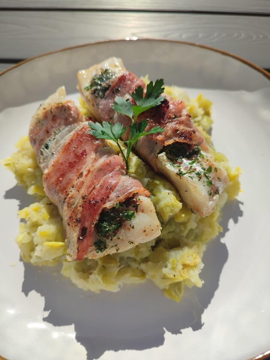Kruidige kabeljauw in een spekjasje en prei-puree