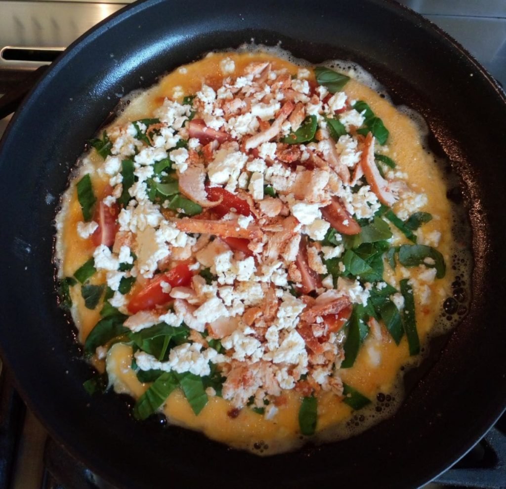 Omelet met groentjes en kaas in de pan