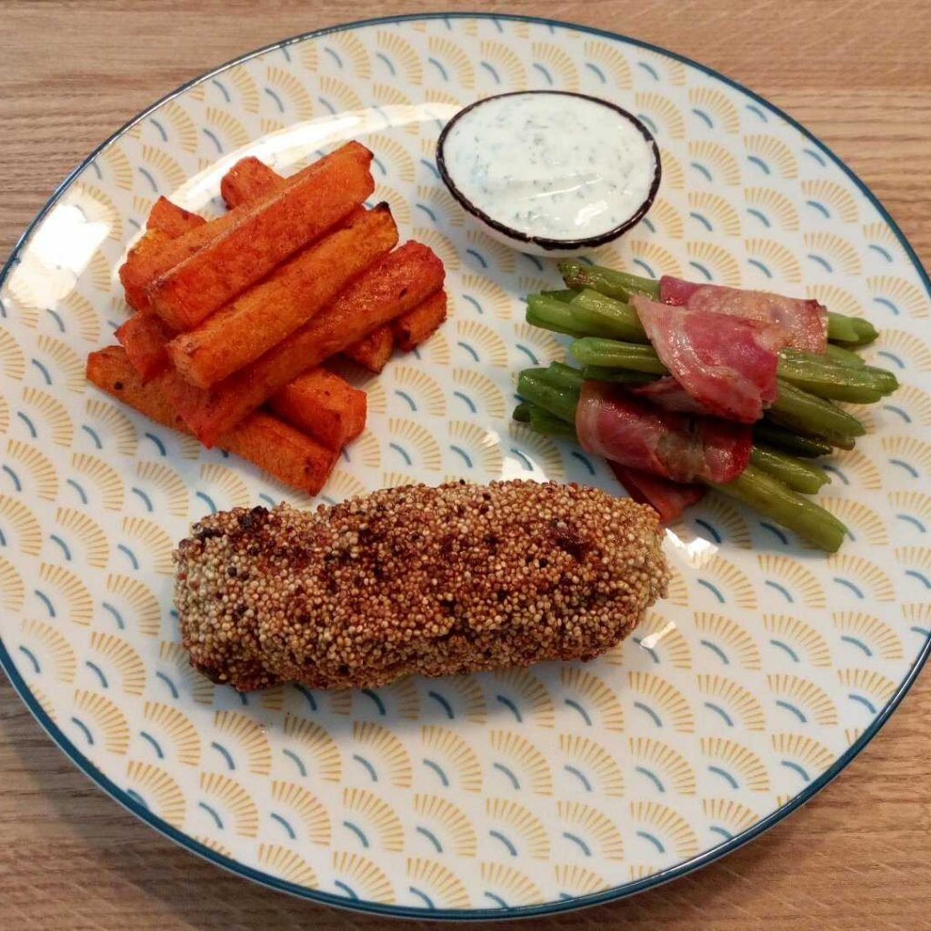 Kalkoenrolletje in een krokant jasje met pompoenfrietjes en boontjes met pancetta