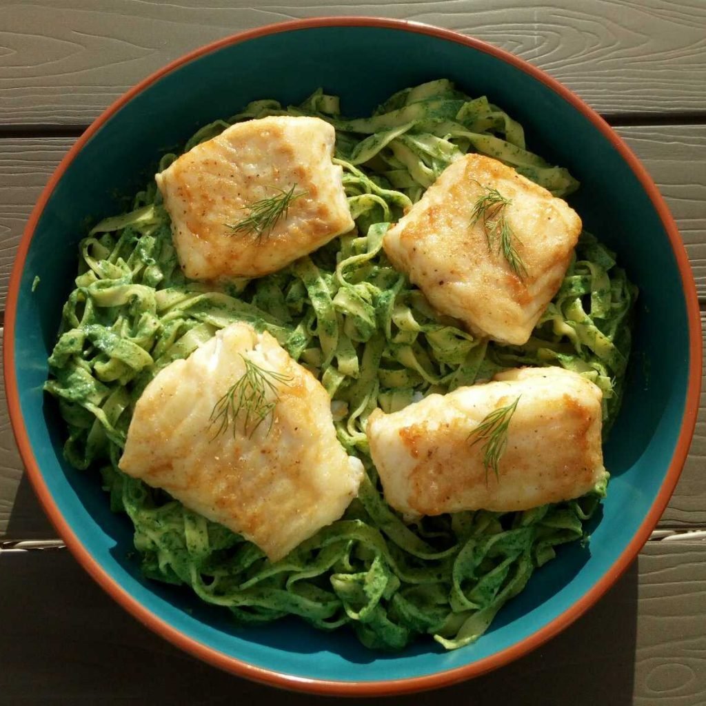 Tagliatelle met spinazie-ricottasausje en kabeljauw