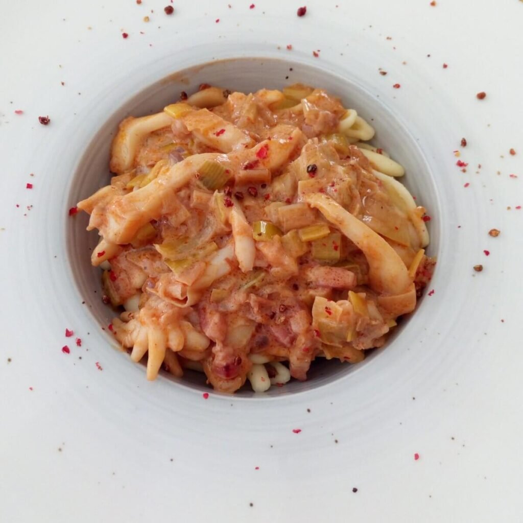 Cavatoni met garnalensaus en inktvis