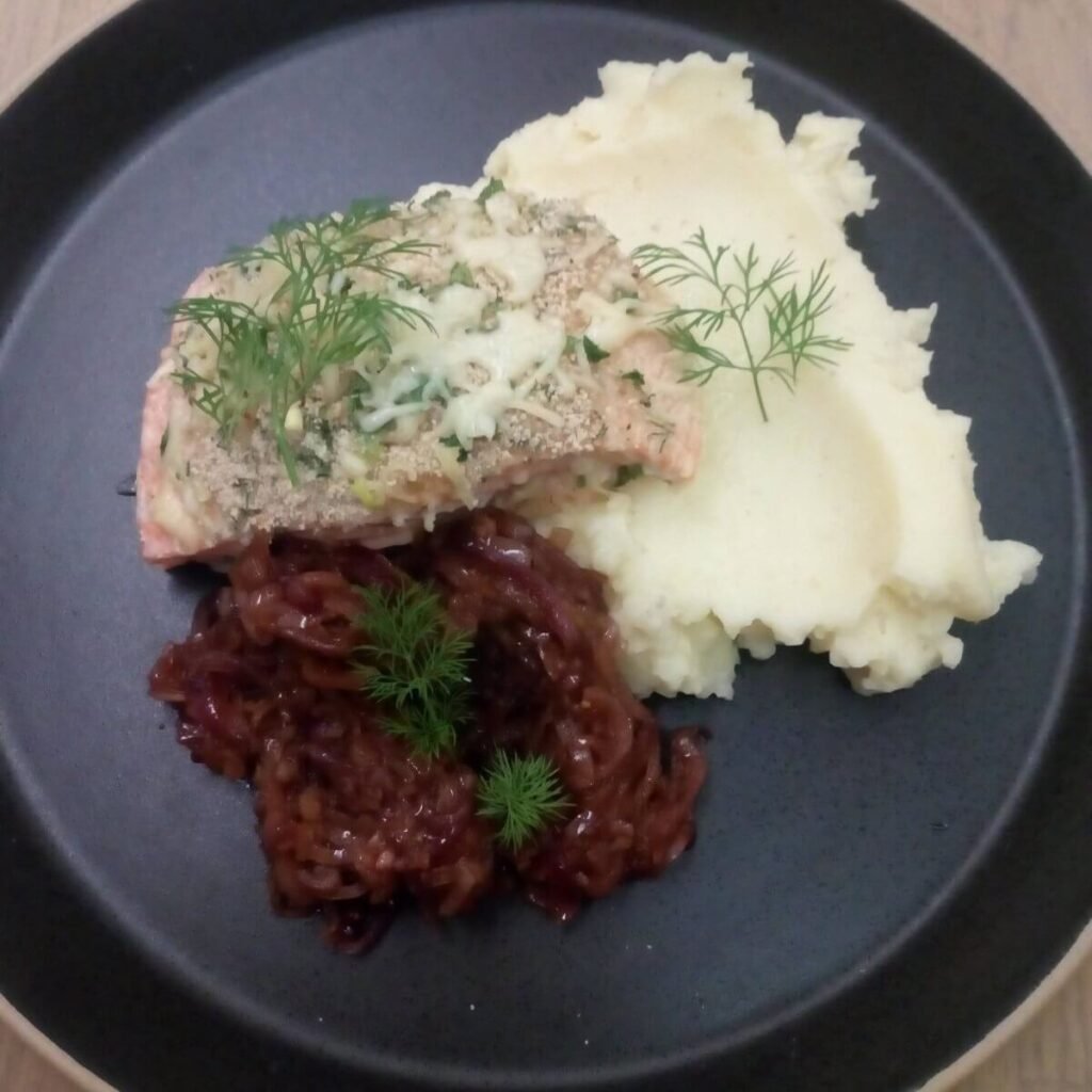 Gevulde zalm met kaas en compote van sjalotjes en rode ui