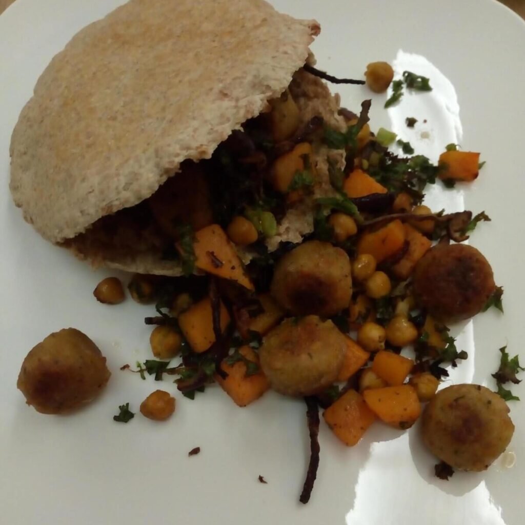Pita met pompoen, falafel en pesto van boerenkool