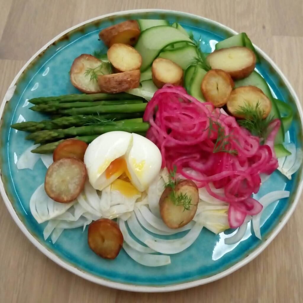 Aardappel-venkelsalade met groene asperges en gerookte makreel