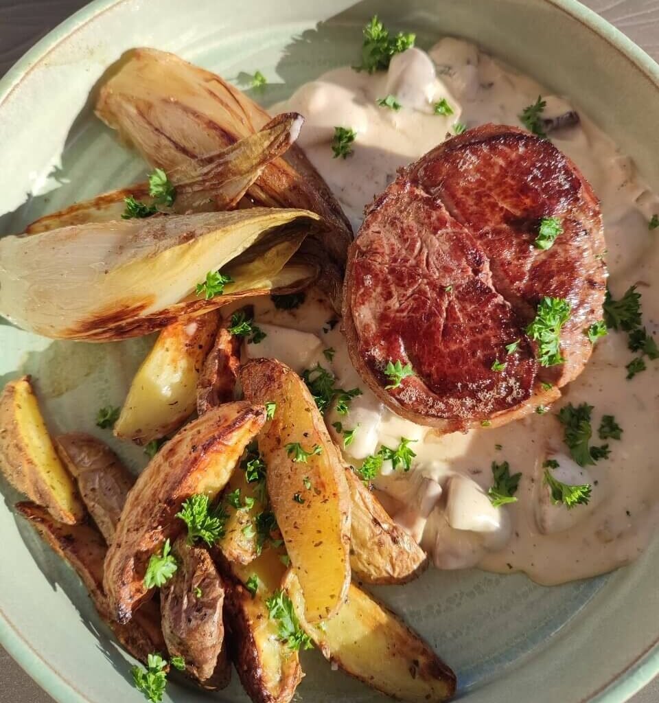 Tournedos met romige champignonsaus, krieltjes uit de airfryer en gebakken witloof