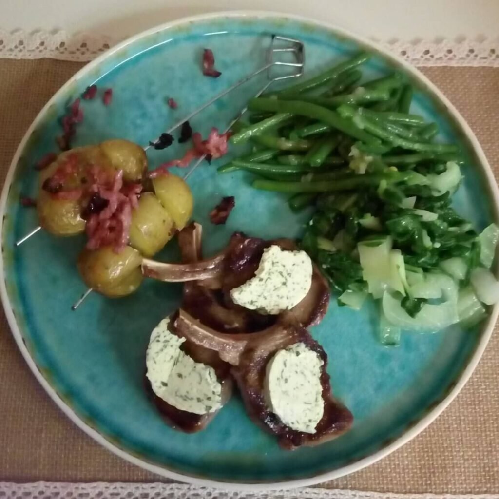 Lamskoteletjes met dragonboter, krieltjes, boontjes en paksoi