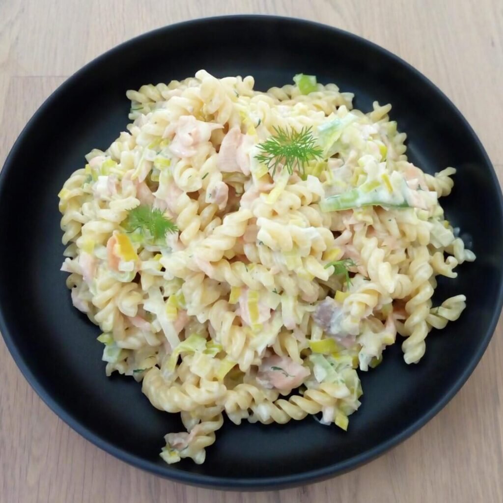 Spirelli met prei, gerookte zalm en mascarpone-saus