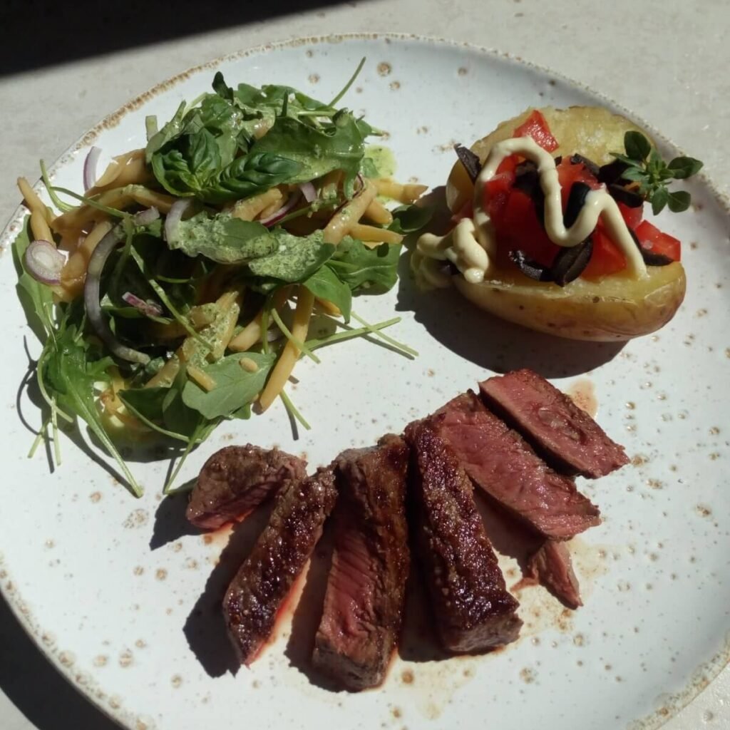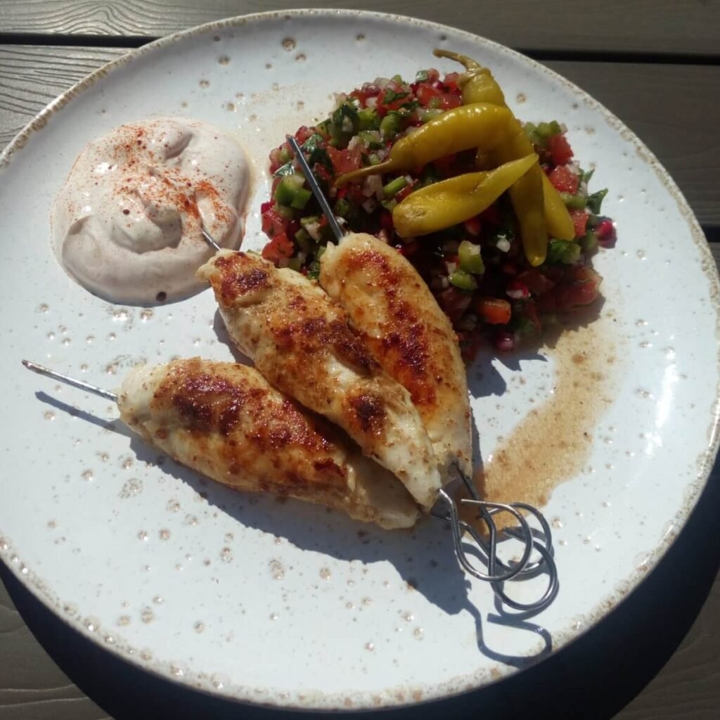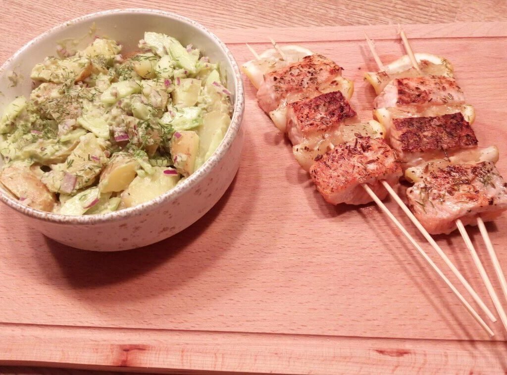 Zalmbrochette, aardappelsalade met avocado-dressing