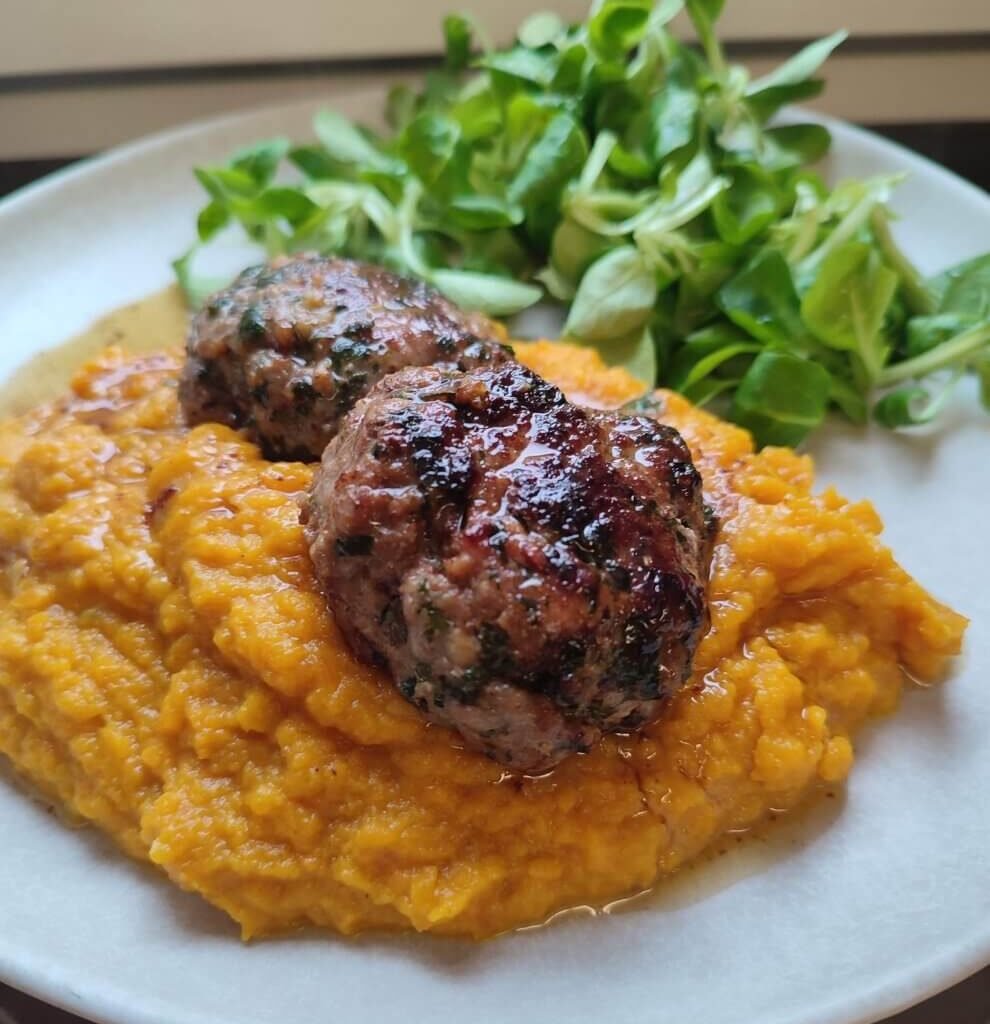 Puree van wortel en zoete aardappel met kruidige hamburgers