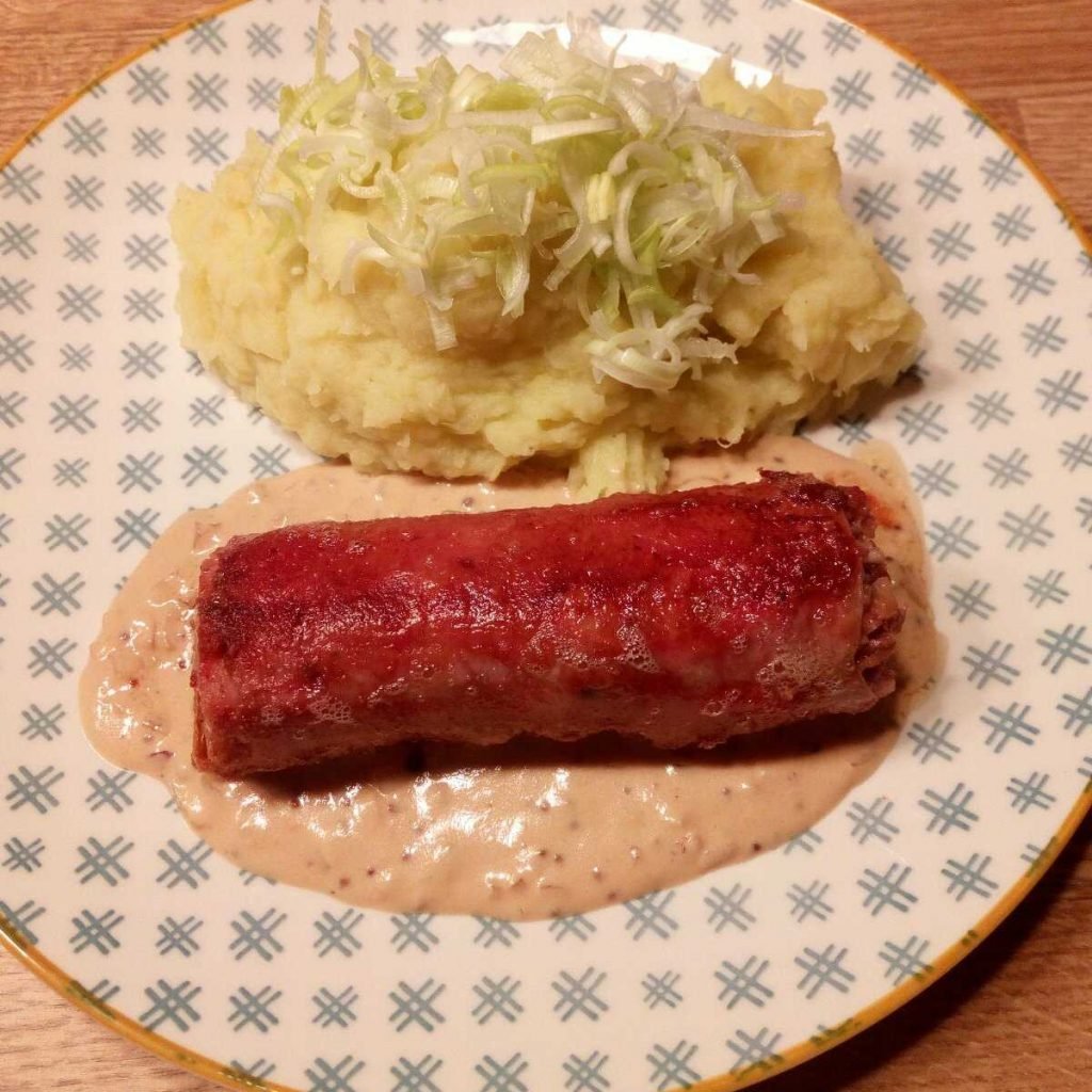 Andouillette de Troyes met mosterdsaus en prei-stoemp