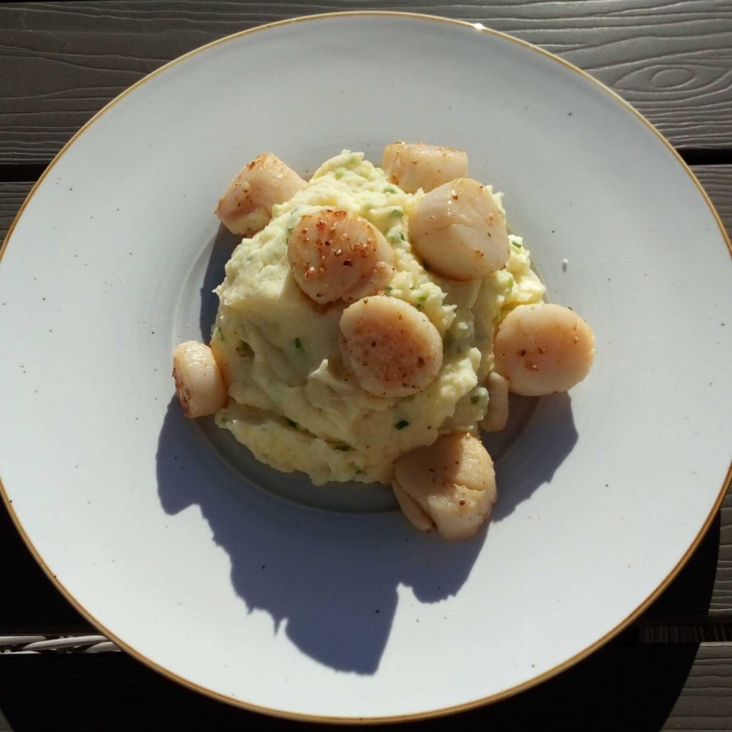 Bieslookpuree, Sint-Jacobsvruchten en crumble van zwarte pens