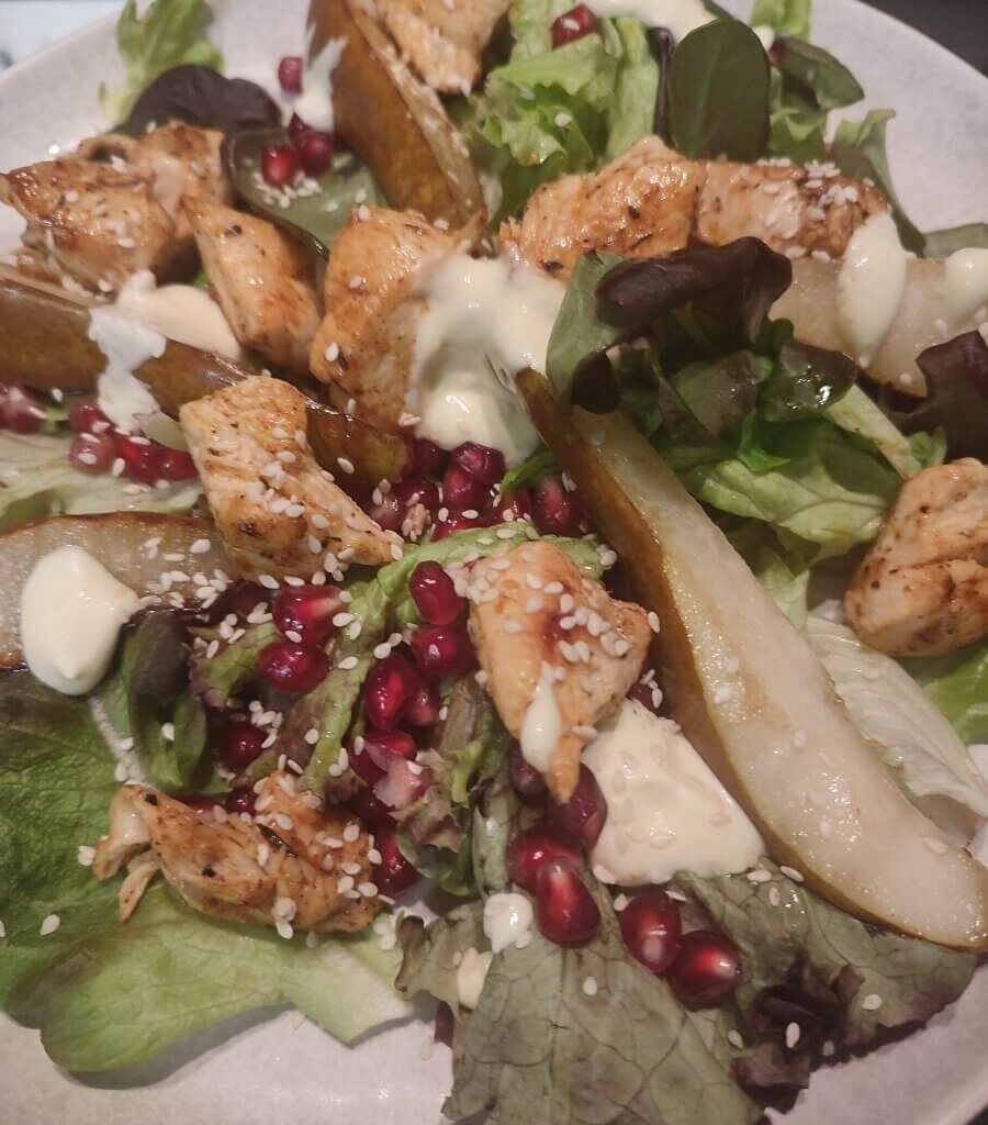 Salade met cajunkip en peer