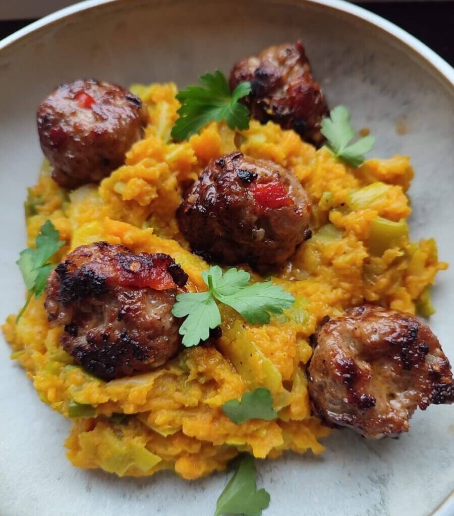 Stoemp van zoete aardappelen met gehaktballetjes