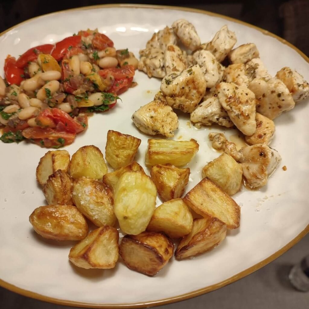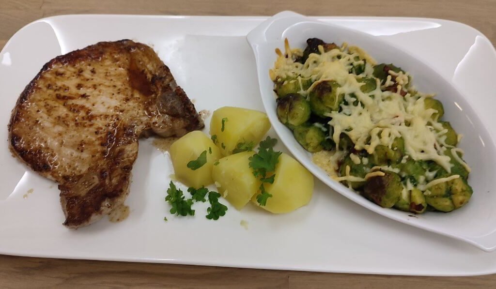 Kotelet met gekookte aardappelen en gegratineerde spruitjes