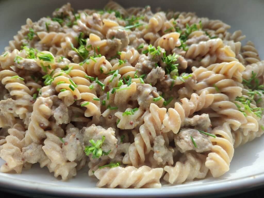 Spirelli met worstjesvlees, granenmosterd en zure room