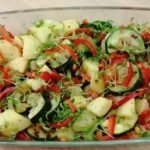 - Meng de aardappelblokjes met de courgette, tomaatjes en de paprika. Besprenkel met het sausje en werk af met de tuinkers.