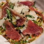 - Werk de borden af en Parmezaan schilfers, stukjes proscuitto en munt.