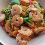 Curry met scampi's, erwtjes, paprika, mango en munt