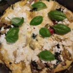 - Breek de eitjes en roer ze los, kruid met kerrie poeder en pezo. Giet het mengsel over het aardappel/groenten mengsel en verkruimel de feta erover. Zet het deksel op de pan en zet het vuur laag, gaar 20 minuten of tot de eitjes zijn gestold.