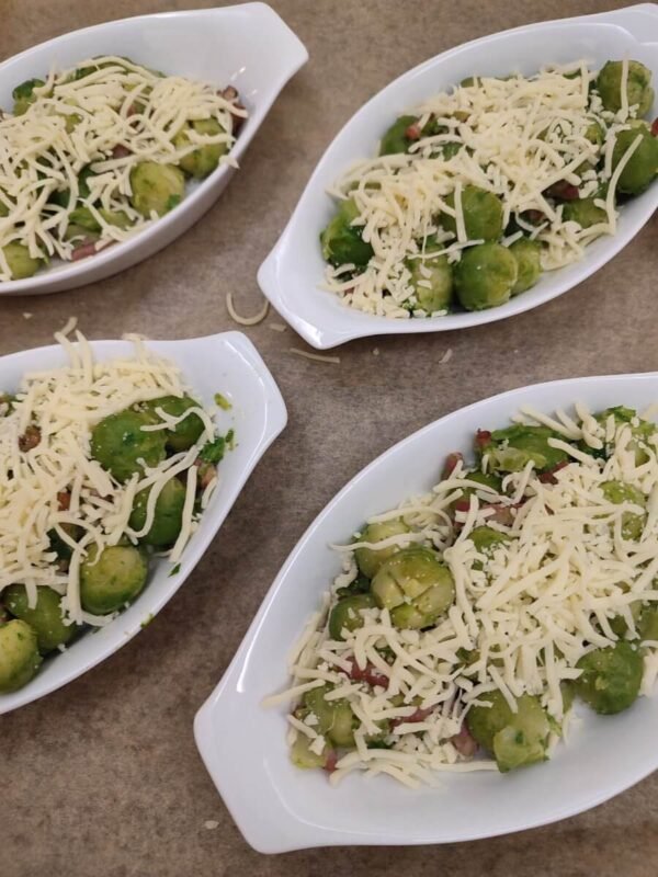 - Snij een kruisje in de stam van de spruitjes en kook ze beetgaar in gezouten water. Voeg ook een beetje bicarbonaat toe. Giet af en spoel onder koud stromend water.