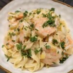 - Voeg als laatste de peterselie en de scampi's toe, warm enkel door en haal van het vuur.