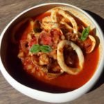 10. Leg de vis erbij en duw hem wat onder in het vocht. Leg de inktvisringen erbovenop. Ook de tomaatjes. Deksel weer op de pot en gaar de vis, dit duurt ongeveer een 3-tal minuten.
