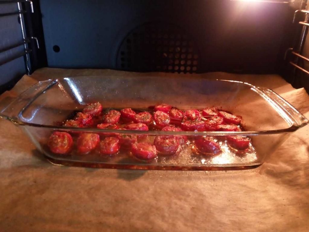 2. Doe de tomaatjes in een ovenschaal, bestrooi ze met de suiker, wat zout en oregano. Leg er een drie takjes tijm bij en besprenkel ze met olijfolie. Zet ze 30 minuten in de oven.