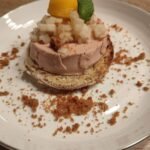 3. Leg op ieder bord een toastje met daarop de foie gras. Werk af met de peer, de kaki balletjes, speculaas crumble en een blaadje munt.