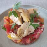 - Verdeel de tomaten in twee serveerringen en leg op ieder torentje drie artisjok partjes.
